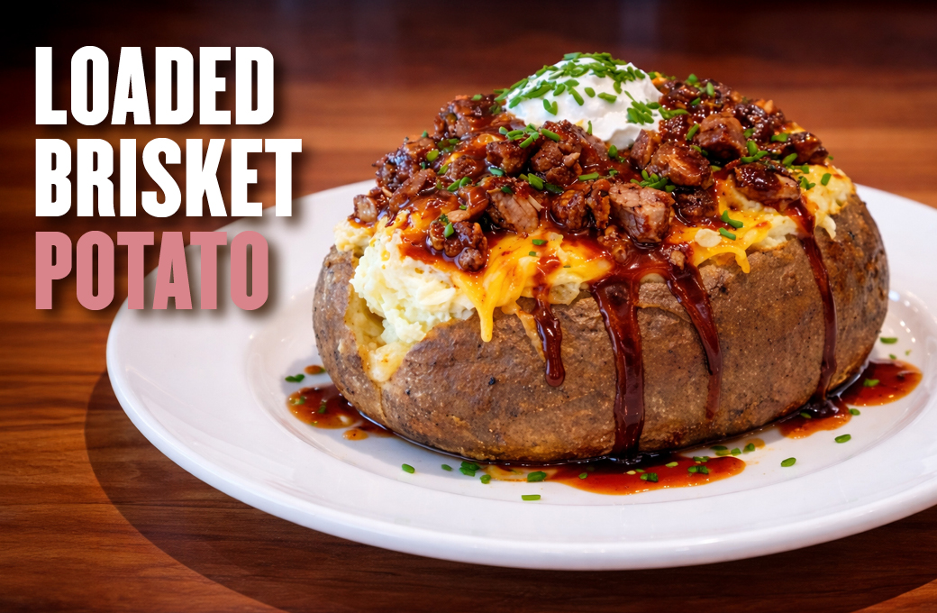 Potato loaded with chopped brisket, Cheddar Jack cheese blend, whipped butter, sour cream, BBQ sauce and chives.