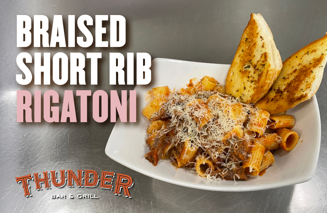 Short rib ragù tossed with rigatoni and topped with Parmesan. Served with garlic bread. (Thunder)