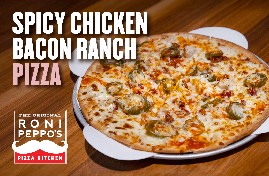 Our famous Chicken Bacon Ranch Pizza topped with jalapeños and Buffalo sauce.